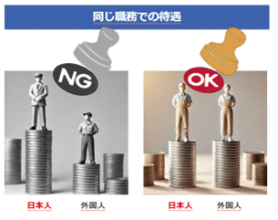 同じ仕事内容であれば、雇用形態(正規・非正規)や国籍を理由とした不合理な待遇差は禁止されており、日本人と同等以上の待遇が原則です。