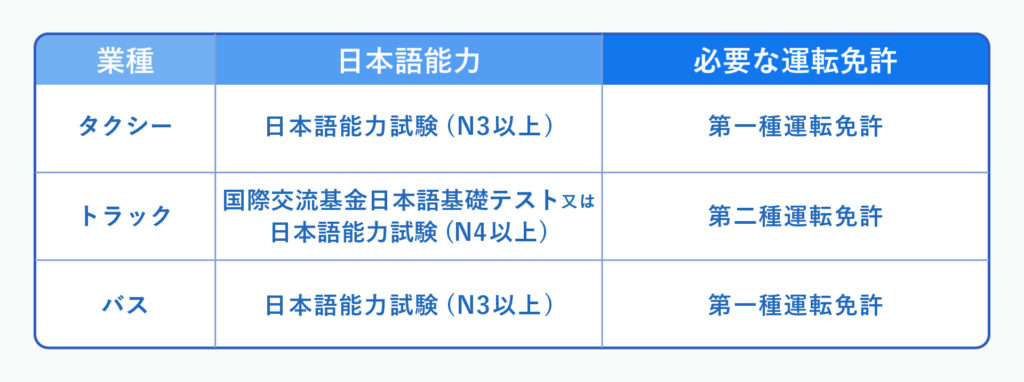 それぞれの要件について確認していきましょう。なお、出入国在留管理庁「自動車運送業分野」の情報をもとに記載しております。