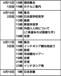 また、3日目にはインドネシア観光のプランも設けておりますので国の文化や特徴なども知ることができる機会になっております。ほかにご希望の観光プランがあればご相談いただければご対応させていただきます。
