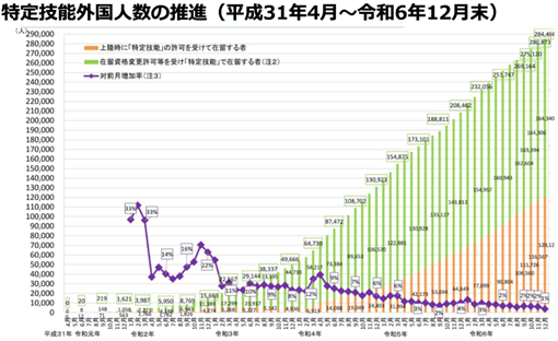 こちらのグラフは、特定技能の受入が開始された日から2024年度までの特定技能外国人の人数推移になります。