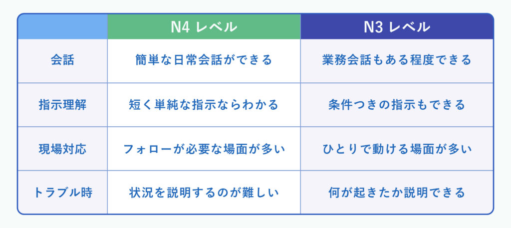 そのため、N4はあくまで就労の入口としての基準であり、「安全に現場で単独業務ができる水準」とは必ずしも一致しない点に注意が必要です。